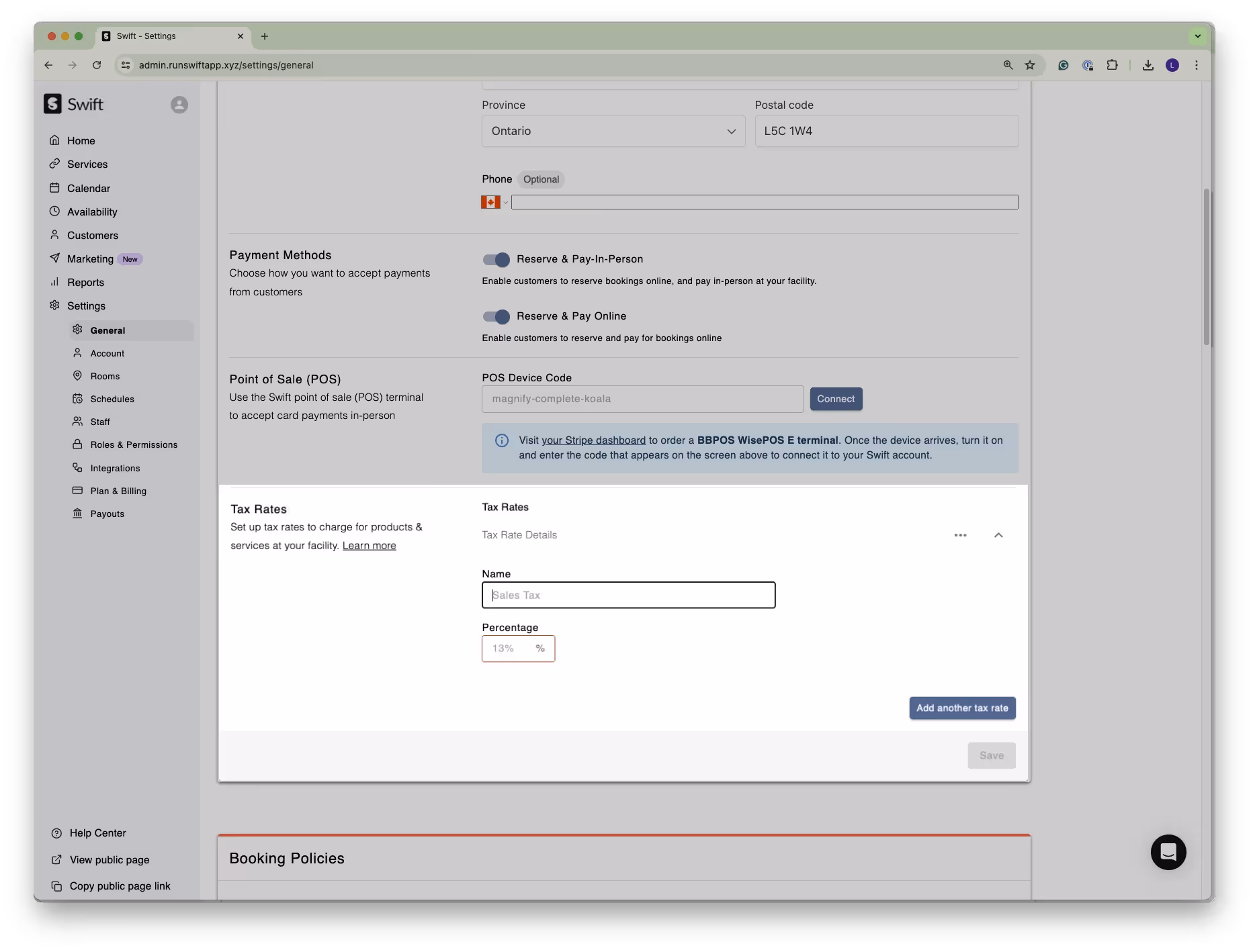 Navigate to the “General” tab under “Settings” and you’ll see a new setting under facility details to add tax rates. Here, you can add a tax rate by specifying a name and a percentage. You can add as many taxes as you need - but tax will not be applied until it is enabled under the specific service settings.