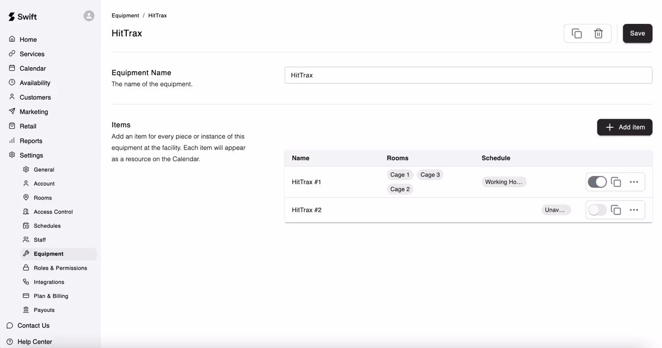 That's not all, though. "Equipment" can actually be linked to various rooms and schedules, meaning that if your HitTrax is only available in one cage and/or only at certain times, you can create that distinction within Swift.