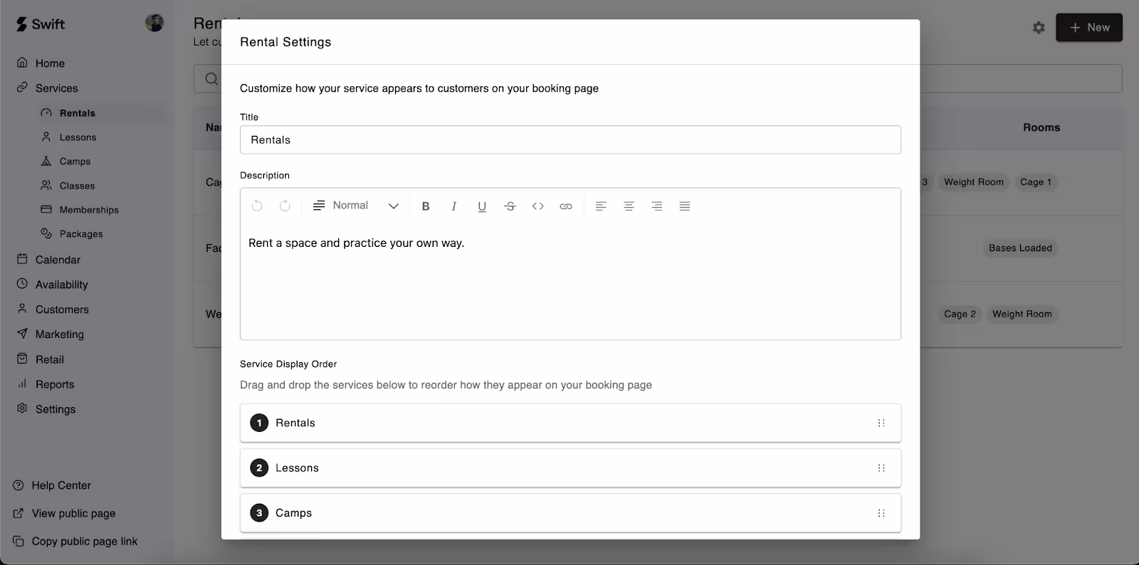 No more default order (like “Rentals” showing up first) if that’s not what you want. Just head to the settings gear on any service category page (like Rentals), select Service Display Order, and drag cards into the order you prefer. Your booking page will instantly reflect the change.